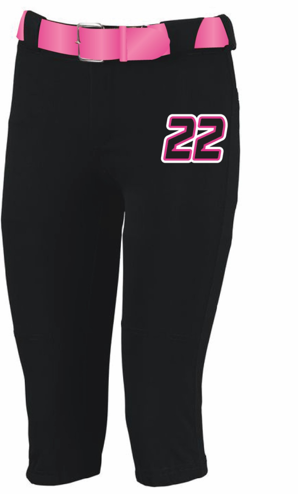 Stock mid-length pants with optional belt and front number.