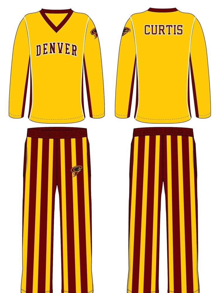 Long sleeve shooter shirt and slip-on pants.