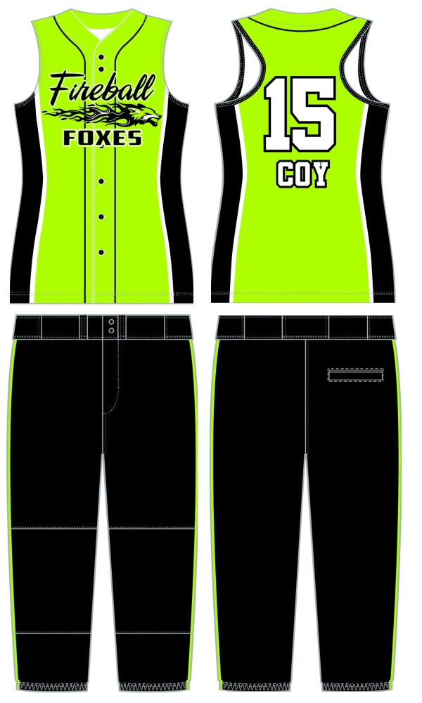 Custom sublimated sleeveless button-down jersey and custom mid-calf pants. Shown with optional racerback.