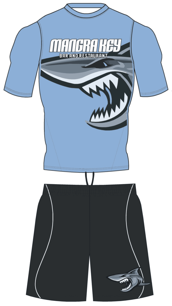 Custom sublimated sleeved compression jersey and matching loose-fit shorts.