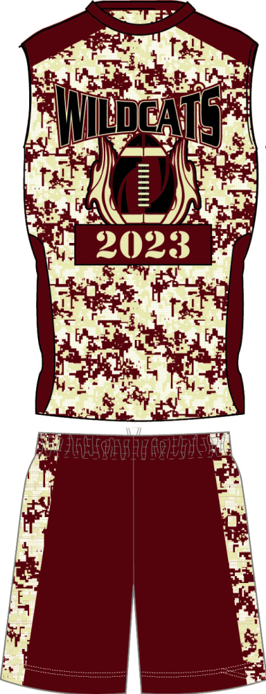 Custom sublimated sleeveless compression jersey and matching loose-fit shorts.