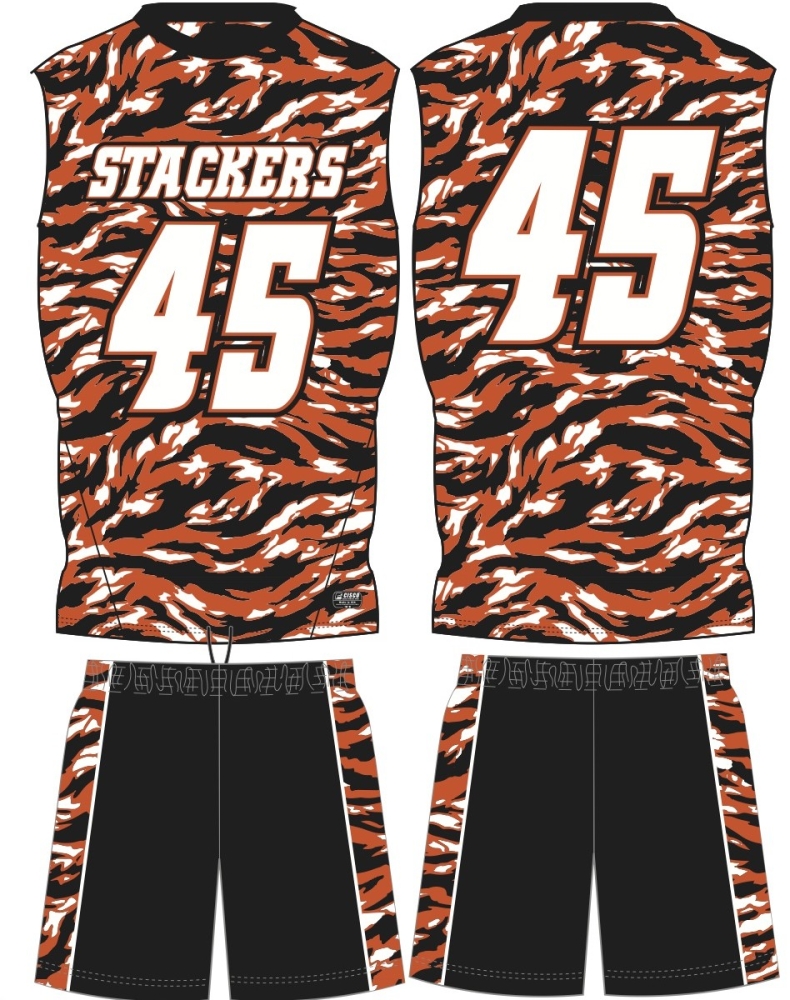 Custom sublimated sleeveless compression jersey and matching loose-fit shorts.