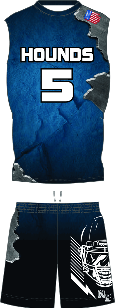 Custom sublimated sleeveless compression jersey and matching loose-fit shorts.