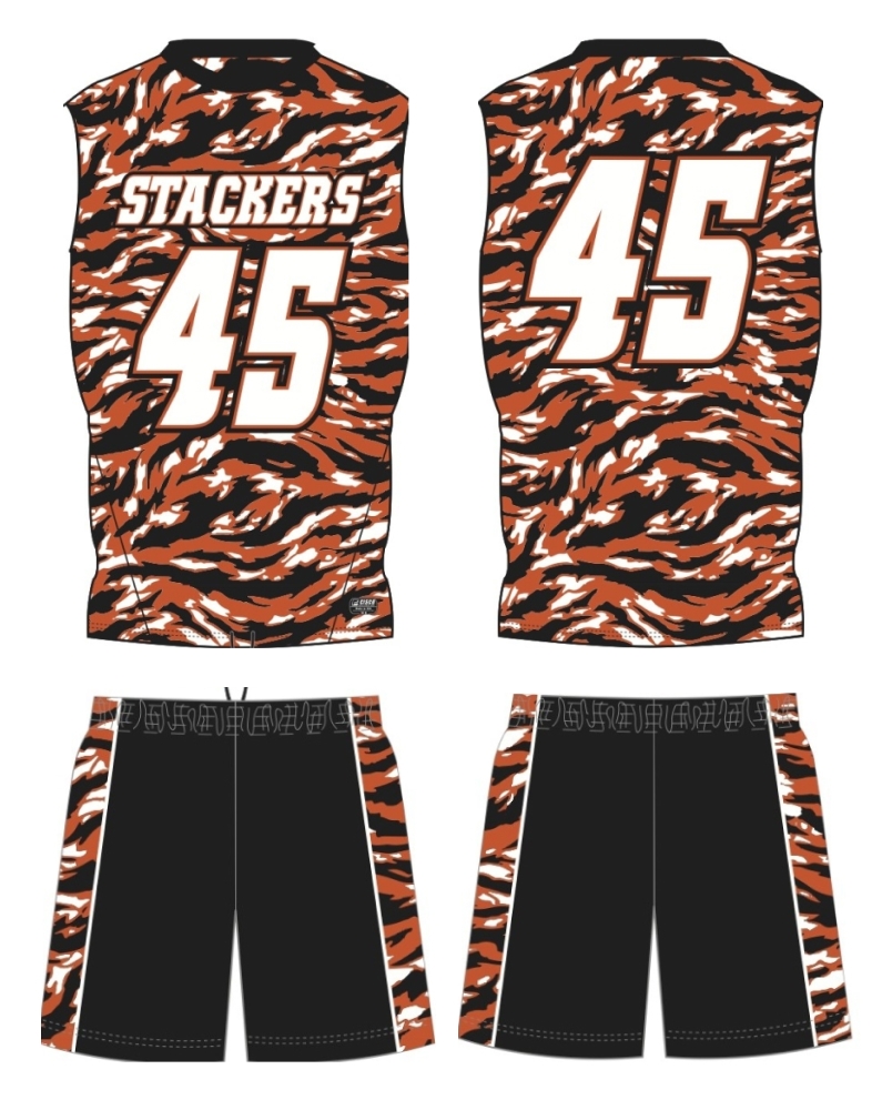 Custom sublimated sleeveless compression jersey and matching loose-fit shorts.