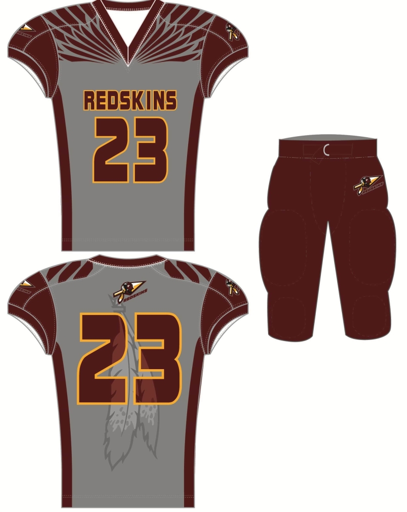 Custom sublimated football jersey. Shown with stock integrated Lycra pants with upper leg embroidery.