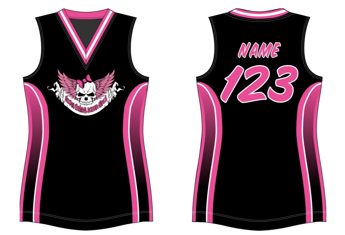 Custom sublimated sleeveless derby jersey. Available in several fabrics.