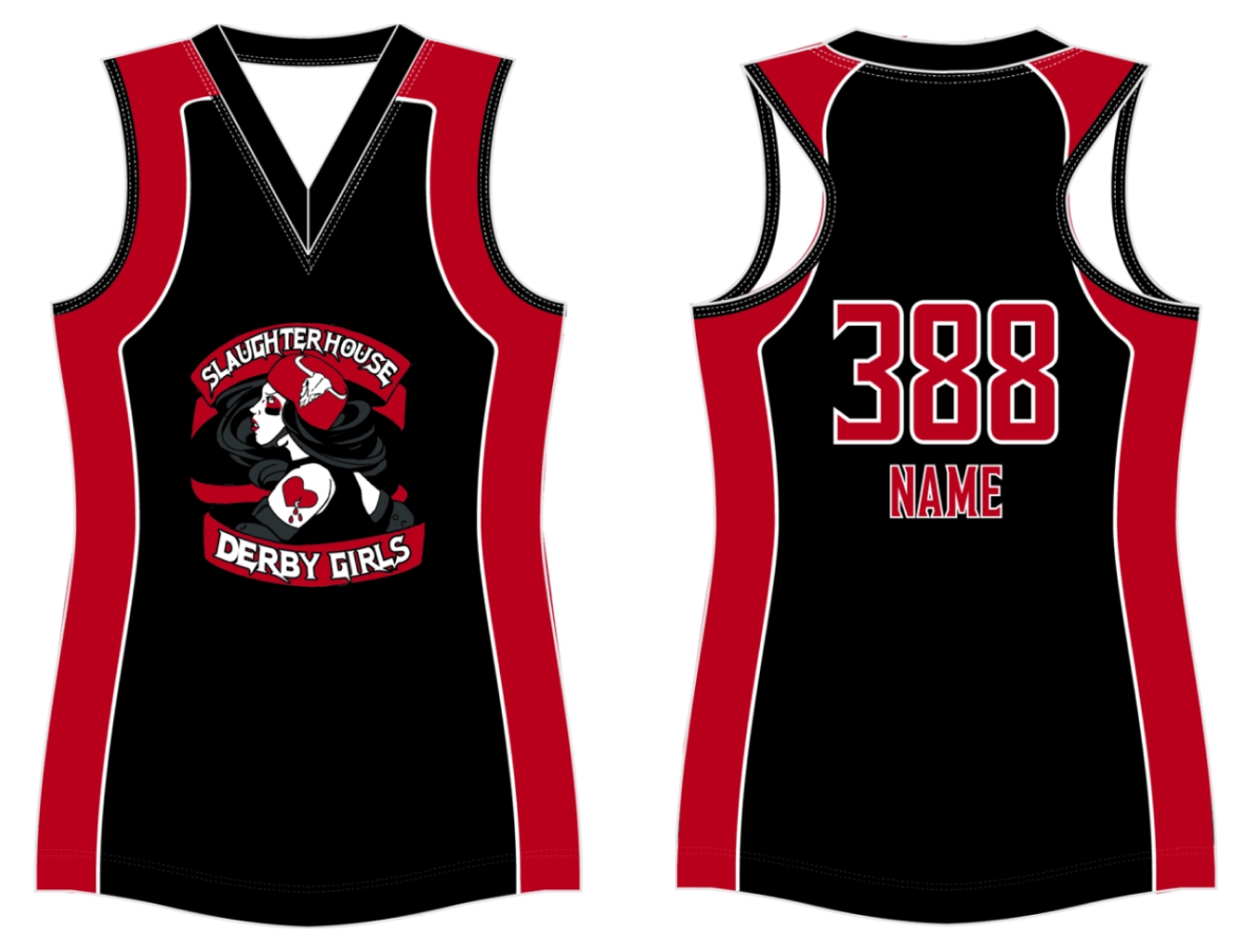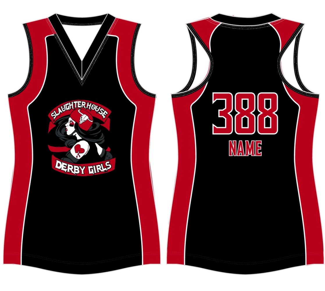 Custom sublimated sleeveless derby jersey. Shown with optional racerback. Available in several fabrics.