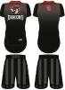 The perfect material for custom wrestling doublets (2-piece uniforms) is Lycra and we offer two different weights of Lycra in all of our doublet styles. Both of these weights are antimicrobial and also moisture-wicking to ensure superior performance both on an off the mat. Sublimation is the ideal way to decorate Lycra and all of our custom wrestling doublets are printed with this process. The process of sublimation results in all lettering and graphics being dyed directly into the material itself. It is a light weight, comfortable athletic uniform for your team and it will never crack or peel.  All of the custom two piece wrestling uniforms that we offer for sale are made of the highest quality materials.